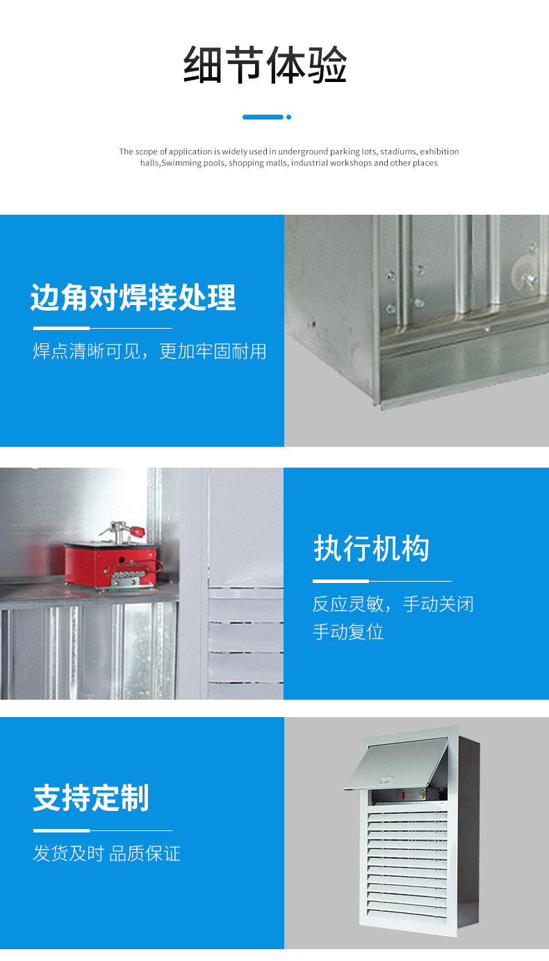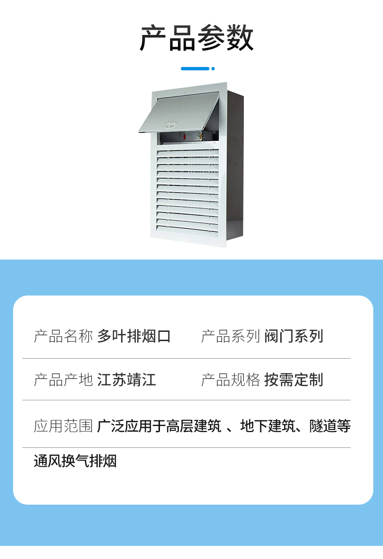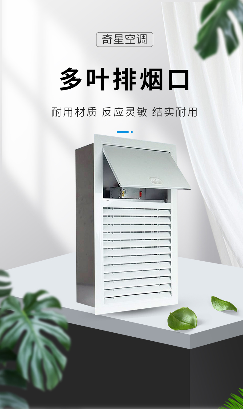 多葉排煙口一般安裝在過道或防煙前室,平時常閉,發生火災時煙感探頭發出火警信號,控制中心給閥上電磁鐵接通電信號使閥門迅速打開,也可人手動迅速打開閥門進行排煙。
