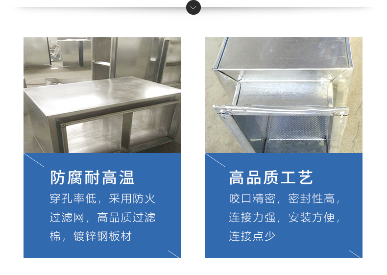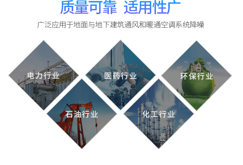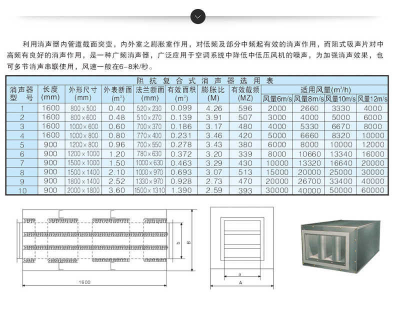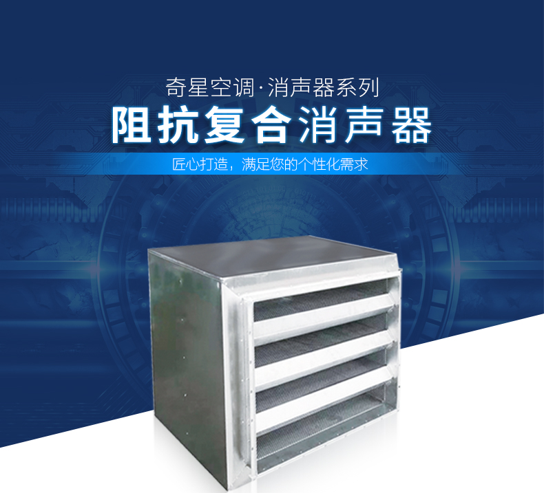 利用消聲器內管道截面突變,內外室與膨脹室作用,對低頻及部分中頻起有效的消聲作用,而阻式吸聲片對中高頻有良好的消聲作用,是一種廣頻消聲器,廣泛應用于空調系統中降低中低壓風機的噪聲,為加強消聲效果,也可多節消聲串聯使用,風速一般在6-8米/秒。